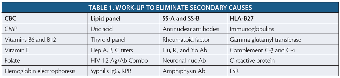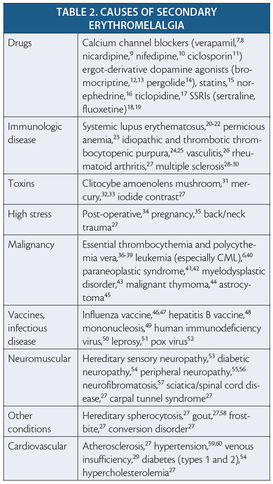 Underlying causes of SEM must be eliminated (Table 2). Patients diagnosed with PEM should still be monitored by CBC to assess for myeloproliferative disorder, which, when present, follows erythromelalgia onset by a median 2.5 years.6