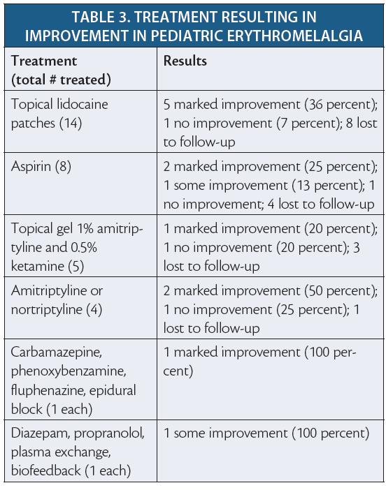 In a retrospective analysis of 32 pediatric patients (mean age 14, range five to 18), Cook-Norris, et al. reported on the efficacy of various therapies with different mechanisms of action (Table 3). Topical lidocaine as the most commonly prescribed treatment.61 Other treatments in pediatric patients reported in the literature include combination of IV lidocaine and oral mexiletine,78 oral mexiletine alone,79 sodium nitroprusside,59,80 recombinant growth hormone,81 regional anesthesia blockade,82 thalamic stimulation,83 gabapentin,84,85 cetirizine,86 and steroids.87